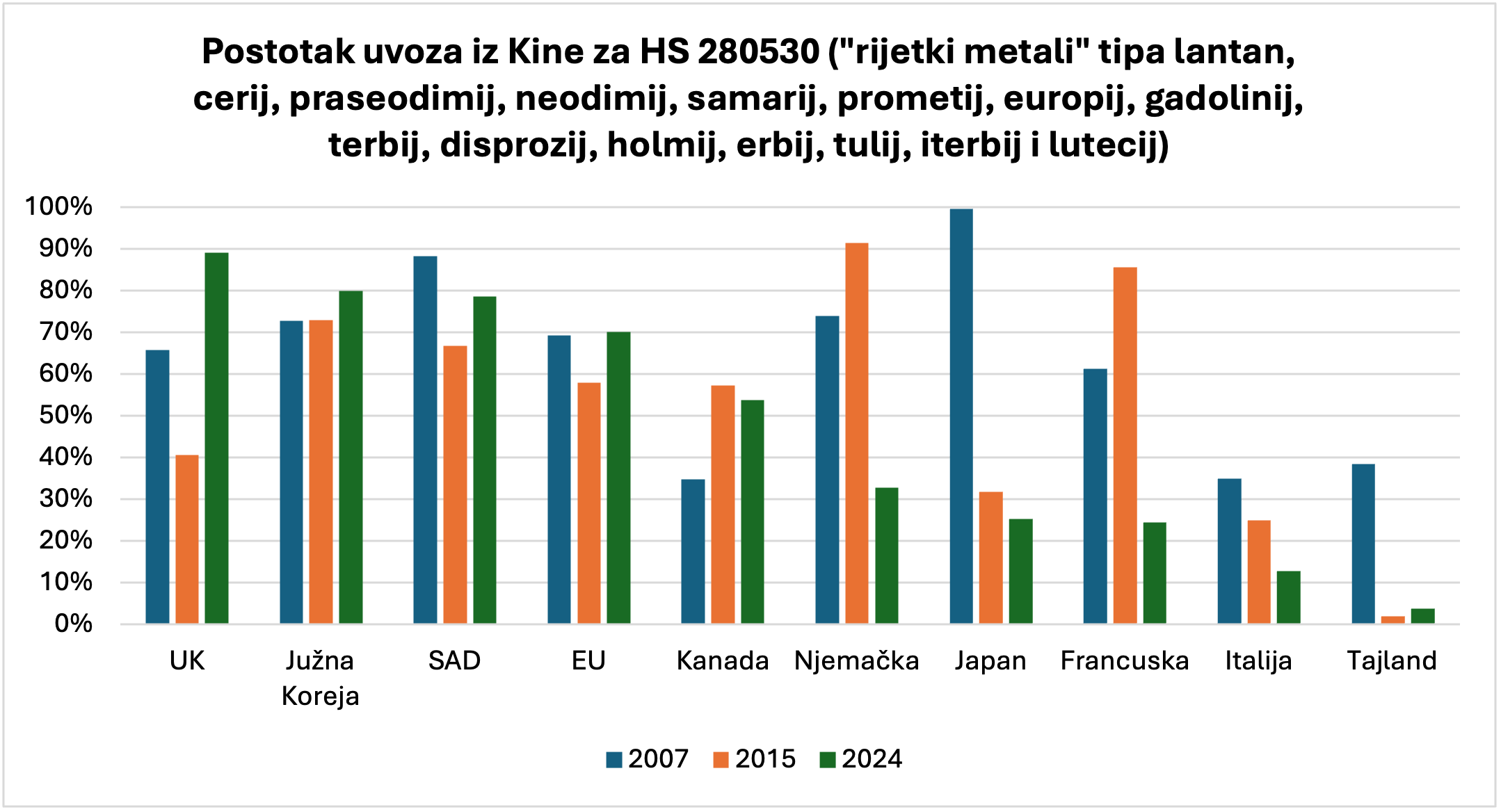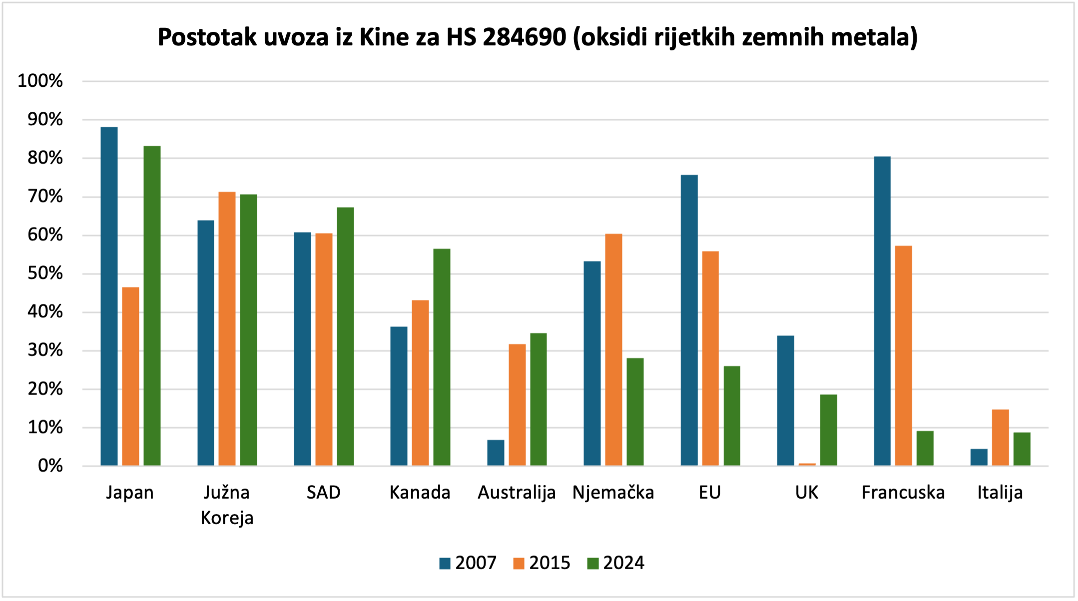 Slika 9, Slika 10 i Slika 11 pokazuju stupanj promjene ovisnosti odabranih država o kineskom izvozu oksida, purificiranih metala i trajnih magneta koji sadrže rijetke zemne metale u periodu od 2007. do 2024. Slika 9 pokazuje da je Europska unija uspjela smanjiti ovisnost o kineskom izvozu oksida i diverzificirala dobavne pravce, dok su druge države poput SAD-a, Japana i Južne Koreje zadržale približno sličan stupanj ovisnosti tijekom promatranog razdoblja. Slika 10pokazuje da SAD, EU i Velika Britanija nisu u značajnoj mjeri uspjele izvršiti diverzifikaciju dobavljača purificiranih metala, premda su pojedine članice EU poput Njemačke, Francuske i Italije uspjele u tome. Zadnje i ne najmanje važno, Slika 11 prikazuje da su sve države značajno povećale ovisnost o uvozu trajnih magneta iz Kine, pri čemu je jedino Japan neznatno uspio smanjiti ovisnost u 2024. godini u odnosu na davnu 2007. godinu. Identificirano povećanje ovisnosti EU-a i SAD-a tijekom promatranog razdoblja uistinu je zabrinjavajuće.