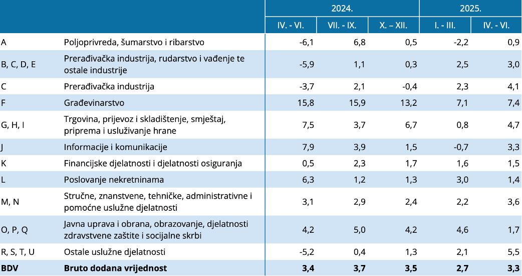 Ako gospodarstvo promatramo prema glavnim djelatnostima i dalje se uočava stara struktura rasta u kojoj prednjači građevinarstvo čija realna bruto dodana vrijednost bilježi godišnji (Y/y) rast od 7,4%, te veliki TTT blok sektora (trgovina, transport i turizam) s 4,7%.