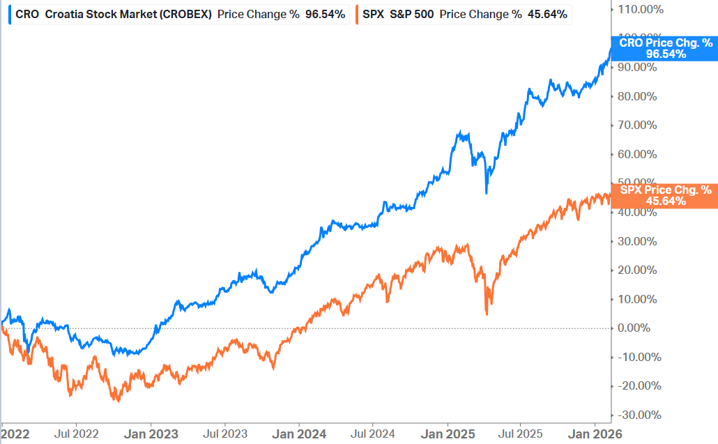 Slika 5. Usporedni prinos CROBEX-a i S&P 500 od 31.12.2021. do 11.2.2026.