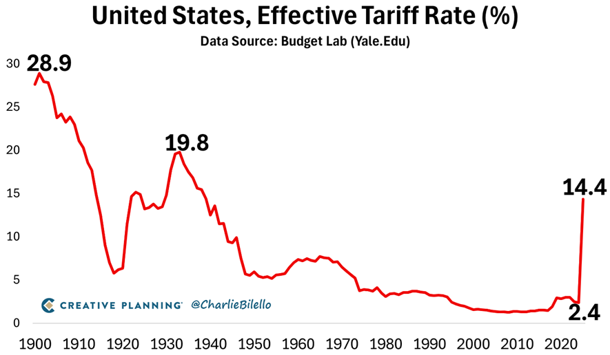 Od tada (praktički do današnjeg dana) S&P 500 je u uzlaznom trendu, bez ikakvog značajnijeg pull-backa. Carine su na kraju određene na puno nižim razinama nego je najavljeno na Liberation Day, uz toliko mnoštvo iznimki da je praktički za svaki proizvod potrebno dobro istražiti koja je aktualna carinska stopa. Posljednje procjene efektivne carinske stope (uprosječene stope na sav američki uvoz) variraju između 14 i 17 posto, što je puno niže od prvotnih najava prikazanoj na slici 2, ali svejedno govorimo o najvišoj efektivnoj carinskoj stopi u zadnjih 90 godina.