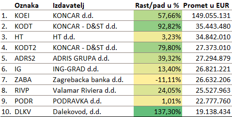 Što se tiče domaćeg tržišta kapitala, ono je bilo obilježeno s 3 nova IPO-a (ING-GRAD, Žito i Tokić), po čemu je naše tržište nadmašilo brojne globalne pandane. Promet dionicama snažno je porastao, a uz iznimku CROBEXnutrisa i CROBEXtransporta, svi su indeksi dvoznamenkasto rasli, i to u rasponu od +11,3%, koliko je zabilježio CROBEXprime, do čak +61% koliko je porastao CROBEXkonstrukt. CROBEX i CROBEX10 ojačali su +21% i +23%, dok su njihove total return inačice, koje uključuju i dividendni prinos, rasle još snažnije (+24,6% i +26%). Najtrgovanije dionice godine bile su one društava KONČAR (KOEI), KONČAR – distributivni i specijalni transformatori (KODT) te Hrvatski telekom (HT).