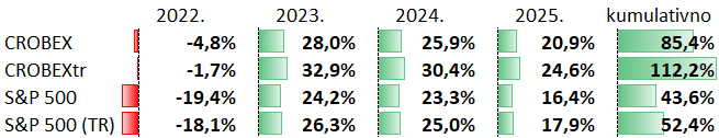 „Ipak, prilika uvijek ima, a kao što smo pokazali na početku teksta, investitori u domaće dionice u zadnje dvije tri četiri godine prošli su značajno bolje nego oni orijentirani samo na najveće (američko) tržište kapitala. Početak 2024. 2025.2026. započeo je s daljnjim rastom cijena dionica na Zagrebačkoj burzi, a kako trenutačno stanje u hrvatskom gospodarstvu upućuje na nastavak gospodarskog rasta i u narednim kvartalima, nije nerazumna pretpostavka da bi i treću četvrtu petu godinu zaredom domaći CROBEX prinosom mogao nadmašiti S&P 500 indeks. Vrijeme će pokazati koliko navedeni „optimizam“ drži vodu.“