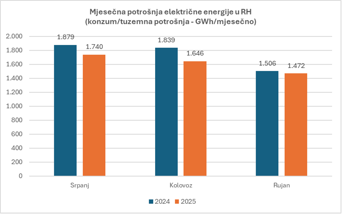 U trećem kvartalu ove godine tuzemna potrošnja električne energije je iznosila 4.858 GWh i manja je za 366 GWh u odnosu na isto razdoblje 2024. godine (5.224 GWh), odnosno ostvaren je pad od 7 %, što je posljedica manje potrošnje za hlađenje. U trećem kvartalu 2025. godine prosječna temperatura u RH iznosila je 23,5 ° C, a u trećem kvartalu 2024. 25,1 ° C. Zbog ove razlike, smanjena je potrošnja električne energije za hlađenje tijekom ljetne sezone u 2025. godini za 273 GWh u odnosu na 2024.godinu.