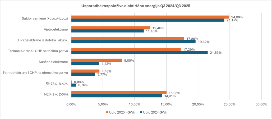 Unatoč rastu proizvodnje iz ostalih obnovljivih izvora, treći je kvartal ove godine ponovno potvrdio visoku ovisnost hrvatskog elektroenergetskog sustava o uvozu električne energije. Zbog snažnog pada proizvodnje hidroelektrana uslijed nepovoljnih hidroloških uvjeta te smanjene proizvodnje termoelektrana na fosilna goriva, u trećem je kvartalu uvezeno 1.210 GWh električne energije, odnosno 24,9 % ukupno raspoložive energije. Iako je uvoz bio nešto niži nego prošle godine, njegova razina ostaje strukturno visoka.