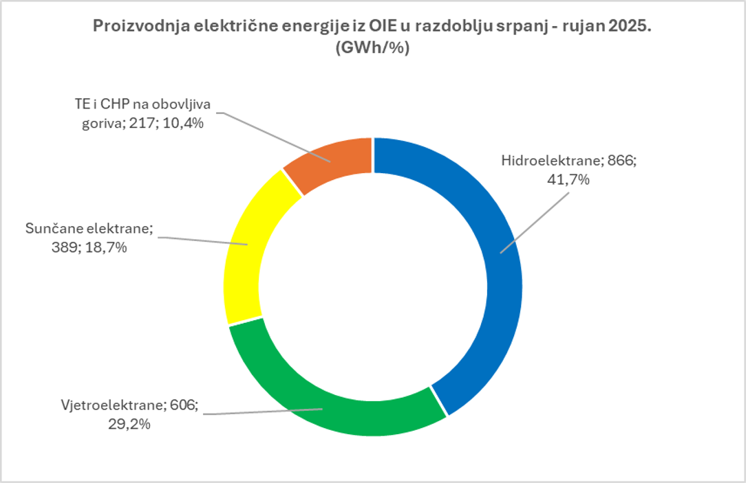 Ostali obnovljivi izvori energije (sunčane elektrane, vjetroelektrane, biomasa i bioplin) u trećem su kvartalu 2025. godine ostvarili proizvodnju od 1.212 GWh, što predstavlja rast od 177 GWh ili 17,1 % u odnosu isto razdoblje prošle godine. Time su i u ovom kvartalu zadržali vodeće mjesto u strukturi raspoložive energije s udjelom od 24,9 %. Usporedbe radi, proizvodnja ostalih OIE bila je za 371 GWh, odnosno 44,1 % veća od proizvodnje termoelektrana na fosilna goriva, dok je u odnosu na isporuku električne energije iz Nuklearne elektrane Krško (50 % udjela koji pripada Hrvatskoj) bila veća za 481 GWh, odnosno 65,8 %.