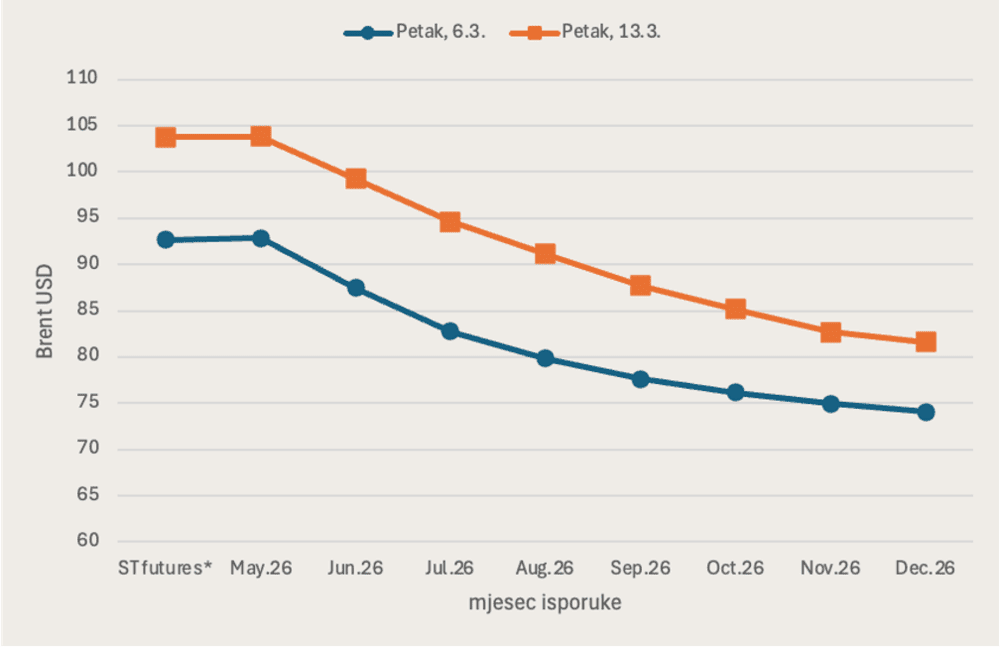 • Nafta Brent zbog takvog razvoja događaja prošli je petak ponovo prešla prag od 100 dolara za barel i završila trgovanje na razini od 103 dolara. Terminski ugovori s isporukom nafte krajem ove godine u prvom tjednu sukoba nisu prelazili 70-75 dolara, uglavnom ignorirajući rat zbog očekivanja brzog rješenja. Međutim, potkraj prošloga tjedna ugovori s isporukom u lipnju prešli su 90 dolara, a s isporukom u prosincu 82 dolara. Na Labu smo u petak objavili i tekst Maria Gatare u kojem su ranije cijene terminskih ugovora nazvane wishfull thinking.