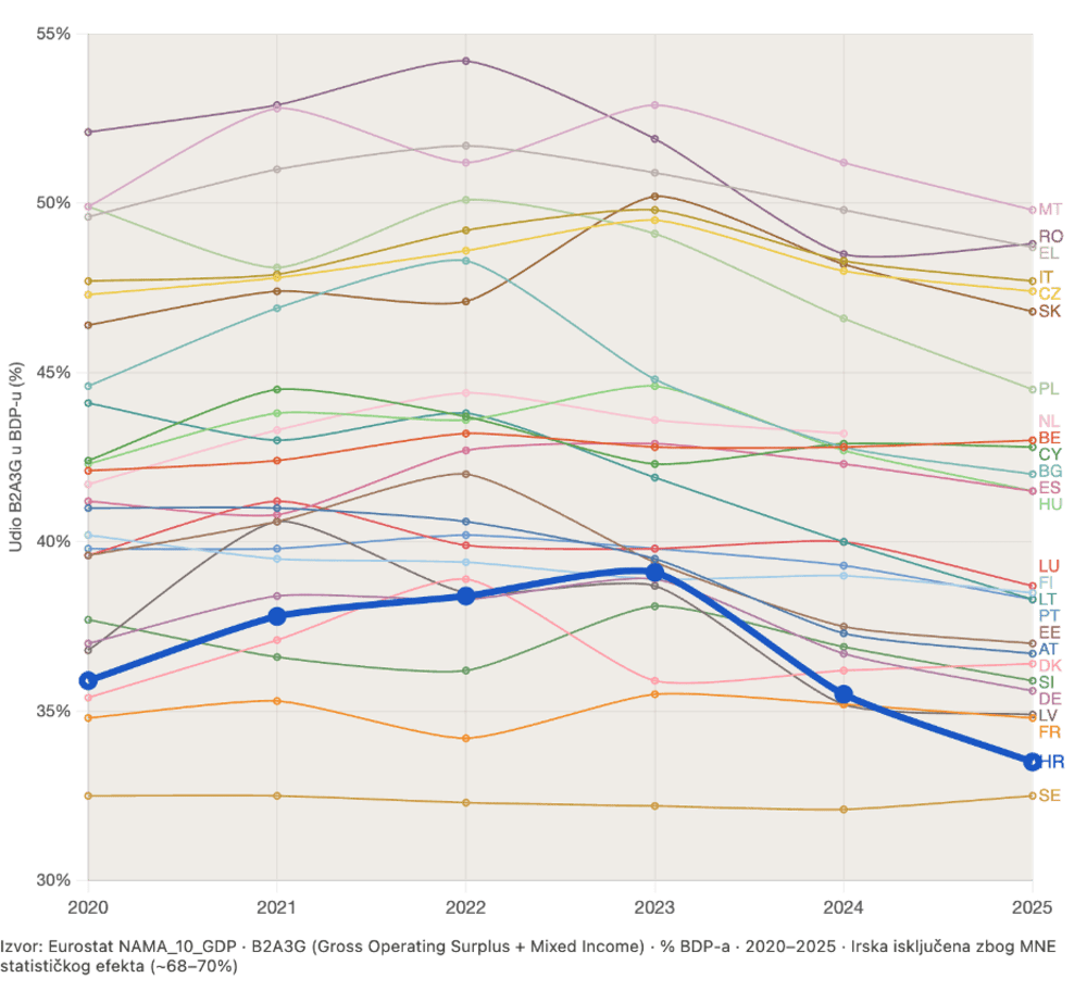 Ne samo da profiti nisu uzrok inflacijskih udara, nego je udjel tzv. operativnog viška koji aproksimira dobit u BDP-u, u Hrvatskoj relativno nizak i u padu