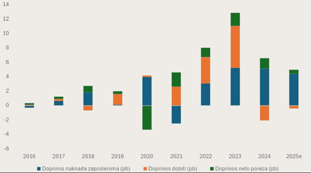 Na tom tragu, u 2024. i 2025. godini situacija se postupno mijenjala. Doprinos dobiti deflatoru slabi, što je u skladu s normalizacijom globalnih cjenovnih šokova, osobito u energetskom sektoru, ali je i u skladu s hipotezom smirivanja razvidnijih odnosa cijena nakon što je inflacijski šok prošao. Istodobno, produktivnost od sredine 2025. ponovno raste i počinje ublažavati učinak rasta plaća. Plaće i dalje rastu, no njihov inflatorni učinak sada je djelomično neutraliziran produktivnošću. Kao rezultat, inflacijski pritisci postupno su popuštali do kraja 2025.