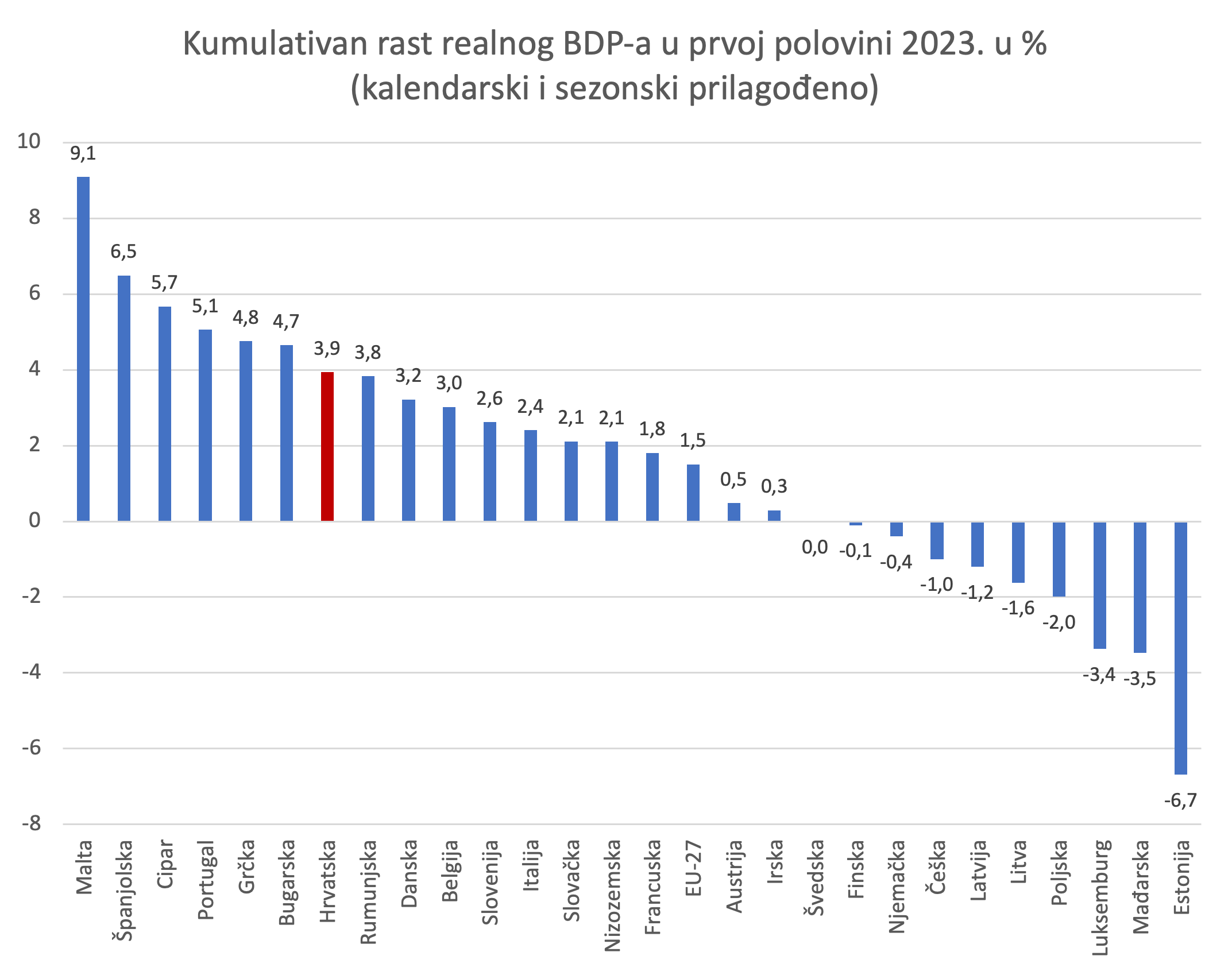 Druga slika prikazuje rast u prvoj polovici ove godine. Hrvatska stoji solidno, ali ne više onako dobro kao do kraja 2022.: zauzima sedmo mjesto u EU prema ovogodišnjoj brzini rasta nakon revizije BDP-a.