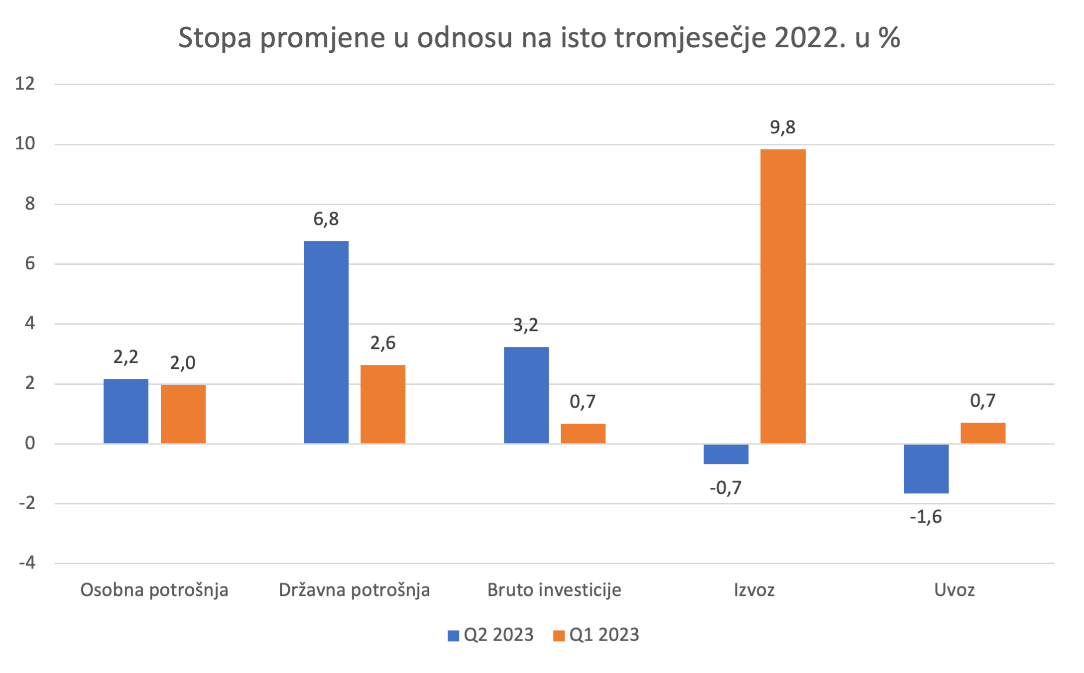 Stoga je najvažnija poruka recentne revizije službenih podataka o BDP-u prikazana na trećoj slici: Realna osobna potrošnja u Hrvatskoj postojano raste, no ukupan izvoz roba i usluga je, nakon faze snažne ekspanzije, u drugom tromjesečju ove godine naglo ušao u fazu kontrakcije. Glavni razlog zašto ukupan BDP u drugom tromjesečju ove godine nije osjetnije usporio (rast je iznosio još uvijek solidnih 2,6%) leži u ubrzanju rasta državne potrošnje i investicija, koje su pod utjecajem korištenja bespovratnih sredstava EU. Nastavak rasta ipak ovisi i o tome kada će europsko gospodarstvo predvođeno Njemačkom doći k sebi.
