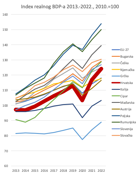 1. Hrvatska je još od 2015. puno uspješnija od Grčke i Italije koje su recimo to tako zaglavile, no u usporedbi s drugim državama na slici realni BDP u Hrvatskoj tek od 2021.-2022. ulazi u razdoblje osjetnijeg „odljepljivanja“ od donjeg ruba slike.