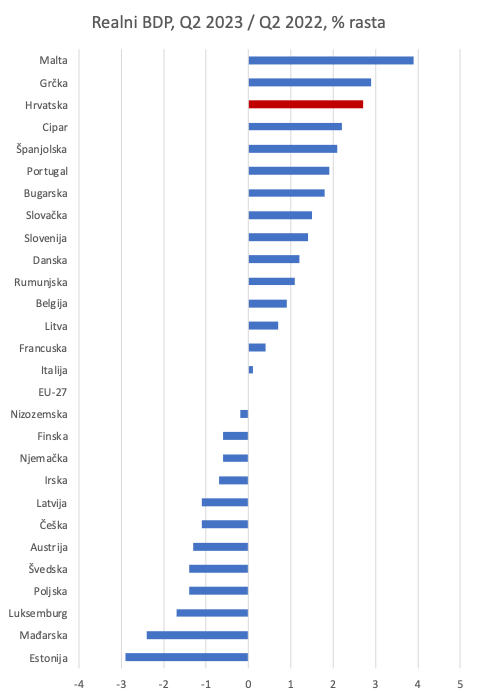 Gornja slika završava s 2022. godinom, pa pogledajmo što se događa ove godine. Druga slika pokazuje stopu rasta realnog BDP-a od drugog tromjesečja 2022. do drugog tromjesečja ove godine (zadnji objavljeni podatak). Hrvatska prema tom kriteriju stoji sjajno: pri samom je vrhu Europske unije.
