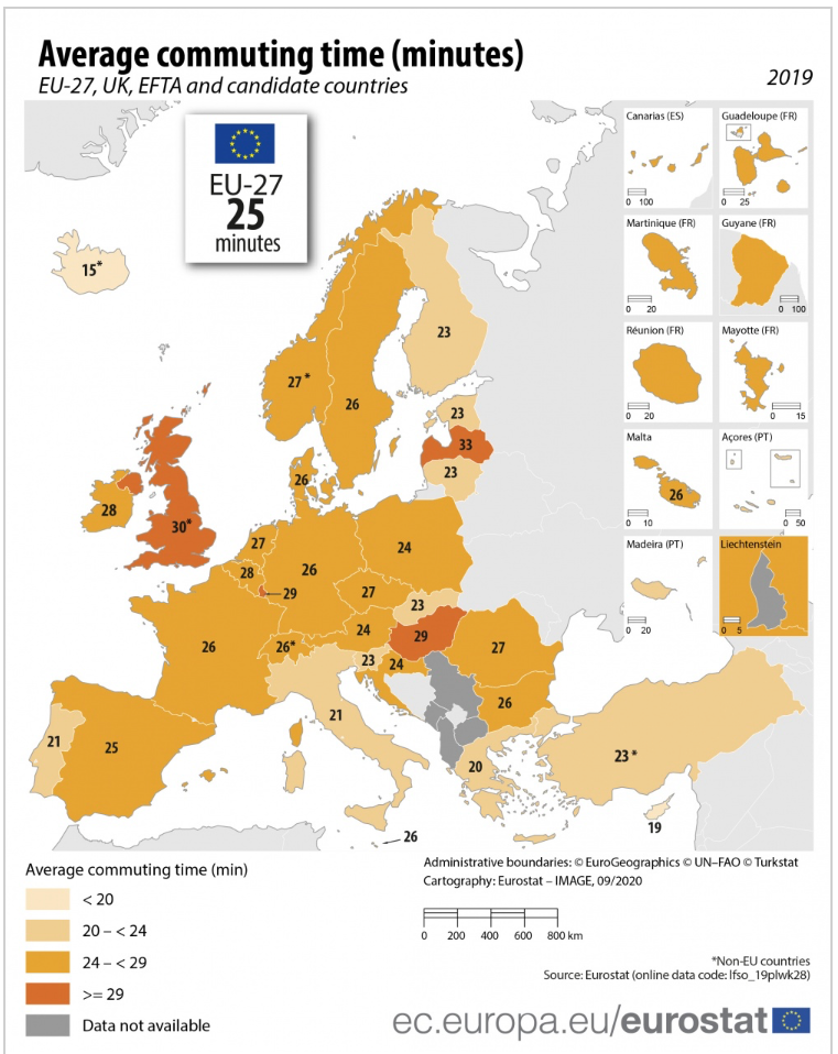 Važno je uzeti u obzir i razlike u vremenu koje ljudi provedu putujući s posla i na posao. S prosječnih 24 minute u jednom smjeru stojimo relativno dobro – samo Grci (20) te Talijani i Portugalci (21) putuju u prosjeku kraće. U Americi (26 minuta) je slično kao u EU: