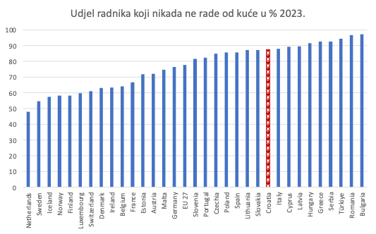 Podaci na gornjoj slici su iz razdoblja prije pandemije. Nakon 2019. došlo je do velikih promjena u načinu rada: rad od kuće štedi puno vremena i energije zbog manje vremena provedenog na putovanju s posla i na posao. Tu smo loši, ali opet slični državama na usporedivom stupnju razvitka; čak 87,6% naših građana nikada ne radi od kuće. U skupini između 85 i 100% koji nikada ne rade od kuće su svi istočnjaci i južnjaci: Bugari, Česi, Grci, Španjolci, Talijani, Ciprani, Litavci, Letonci, Mađari, Poljaci, Rumunji, Slovenci, Slovaci, Srbi i Turci. Najmanje postotke onih koji nikada ne rade od kuće pronalazimo opet u Nizozemskoj (48%) i nordijskim zemljama (50-60%). Prema tome očekujemo da je zbroj vremena provedenog na poslu i na putu na posao i s posla još povoljniji u korist građana u zemljama u lijevom dijelu donje slike: