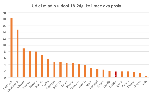 U SAD-u je udjel ljudi koji prihvaćaju drugi posao dugo bio stabilan između 4,5 i 5,5%, ali se nakon pandemije našao u porastu (vidjeti ovdje). U američkim raspravama ova se pojava često povezuje sa stagnacijom ili padom životnog standarda dijela ljudi koji su prisiljeni raditi više poslova, premda statistike koje podupiru ovu tezu nisu jednoznačne. Udjel radnih ljudi koji rade dva posla niži je u EU (4,1%) nego u SAD-u i dugoročno stagnira. Međutim, u EU nije slučaj – kao što bi se očekivalo na temelju američkih rasprava, da do toga dolazi zbog rasta udjela osoba s dva posla u slabije razvijenim državama članicama ili državama koje imaju gospodarske poteškoće gdje ljudi prihvaćaju drugi posao zbog spajanja kraja s krajem. Do toga uglavnom dolazi zbog naglog rasta ove pojave među mladima u najrazvijenijim državama članicama, gdje je i stupanj njihovog obrazovanja najveći. Srbija se jedina od slabije razvijenih zemalja ušuljala u razvijenu skupinu u lijevom dijelu slike):
