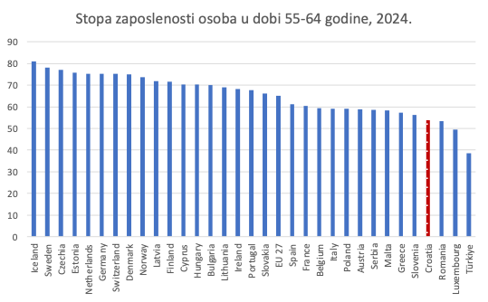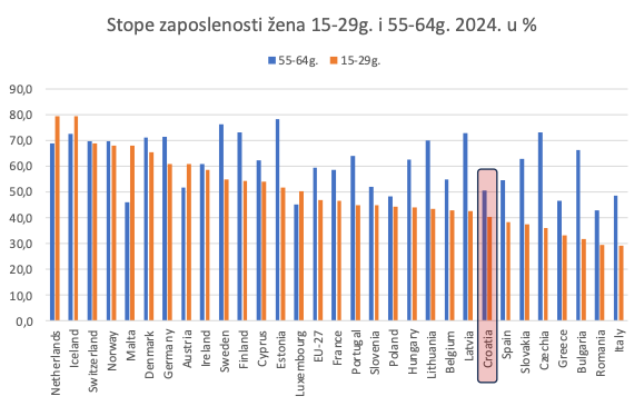 I dok smo prema radnoj aktivnosti starijih radnika na gornjoj slici još uvijek pri dnu Europe (razglabanje o razlozima odvelo bi nas predaleko, to je tema za neki drugi tekst), radna aktivnost žena u naglom je porastu. O tome sam detaljno pisao pred godinu dana, pogledajte detalje. U međuvremenu, stigli su podaci za 2024. godinu koje sam sortirao prema stopi zaposlenosti žena u dobi 15-29g., ali sam dodao i stupiće koji prikazuju stopu zaposlenosti žena u dobi 55-64. Iako se ne može mjeriti s Nizozemskom i nordijskim zemljama, Hrvatska je daleko od dna EU. Plavi stupići pokazuju da žene u starijoj dobi prema radnoj aktivnosti već sustižu Austrijanke. Bez obzira govorimo li o zaposlenim mladim ženama i majkama, ili o njihovim majkama – tradicionalnim baka-servisima, u obje dobne skupine žena postoji snažan poticaj za rad od kuće ili rad uz skraćeno radno vrijeme, ili honorarni posao, jer kućanski i odgojni poslovi koji su se nekada obavljali uz dovoljno vremena izvan tržišta rada, danas se u sve većemu broju, barem jednim dijelom, pokušavaju obaviti u hibridnim uvjetima kombiniranja angažmana u obitelji i na tržištu rada. Radi se o procesu koji je tek započeo u smislu brzine: mislim da će u sljedećih 10-15 godina doći do vrlo brze konvergencije radne aktivnosti žena u mlađoj i starijoj dobi (žene od 30-54g. već su radno aktivne ili aktivnije od prosjeka EU) prema europskom prosjeku, ili nešto iznad toga praga. To će se događati uz fleksibilnije oblike radnih ugovora, što može značiti i manji prosječni radni angažman u smislu broja sati po jedinici kalendara.