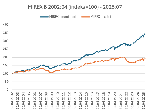 Ako pogledate kretanje linije MIREX-a B na donjoj slici (nominalno i realno – prilagođeno za inflaciju), uočit ćete nekoliko važnih stvari. Rast MIREX-a je u prvih sedam mjeseci ove godine iznosio oko 5,5% nominalno i oko 3,5% realno. Osim što je takav rast daleko brži od povijesnih prosjeka (od travnja 2002. nominalno anualizirano 5,5%, a realno 2,9% u fondovima kategorije B), Končar objašnjava cjelokupan ovogodišnji „višak“ iznad povijesnih prosjeka, i više od toga.