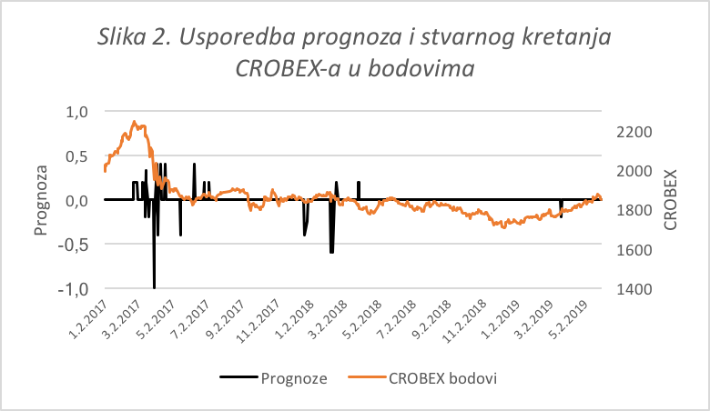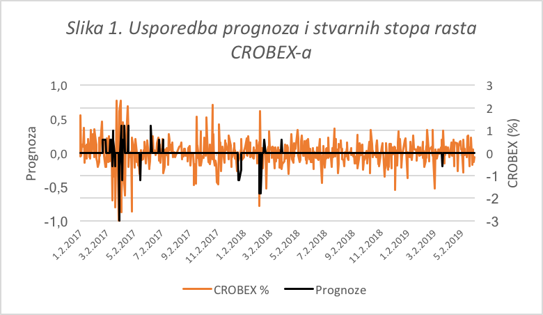 Na slici 1. možemo vidjeti usporedno kretanje kvantificiranih prognoza analitičara iz Hinine ankete te stvarnih dnevnih stopa rasta CROBEX-a. Ukoliko su svi analitičari jednoglasno rekli pad, takva prognoza je kvantificirana s -1; ako su svi rekli stagnacija, to je kvantificirano kao 0; dok bi unisona prognoza rasta vrijedila 1, no takav slučaj se nije dogodio u analiziranom periodu. Također, uzeto je u obzir da nisu uvijek sve prognoze bile jednoglasne. Primjerice, ako je dvoje analitičara prognoziralo pad, a troje stagnaciju, takva prognoza vrijedi -0,4. Ili ako je jedan prognozirao rast, a četvoro stagnaciju, takva prognoza vrijedi 0,2.