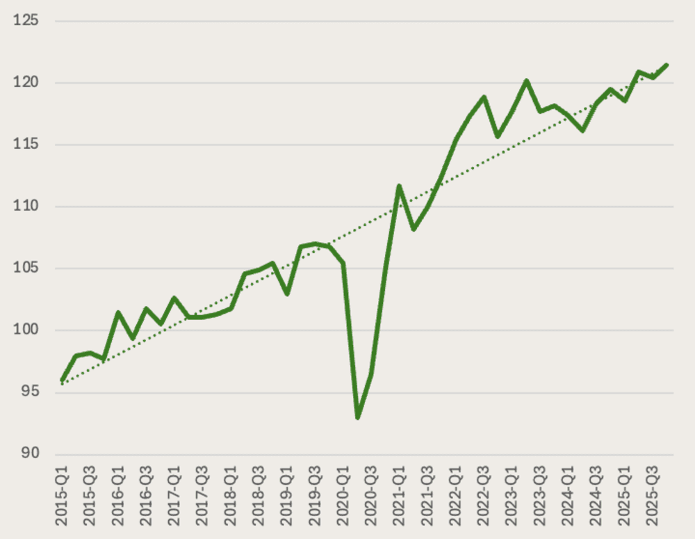 To je dobra vijest budući da je rast produktivnosti rada 2023. i 2024. nakon velikog uzleta 2022. zastao. Grafikon 3 uključuje moju procjenu rasta produktivnosti rada u zadnjem tromjesečju prošle godine i pokazuje da se produktivnost nakon dvije godine stagnacije vraća dugoročnom rastućem trendu. To je važno, jer iako su stope rasta BDP-a 2023. i 2024. bile veće nego 2025., one bez rasta produktivnosti nisu održive. I sporiji gospodarski rast može biti bolji ako je održiv u smislu uključivanja rasta produktivnosti. Naposljetku, u dugom roku o tome zavise realne plaće.