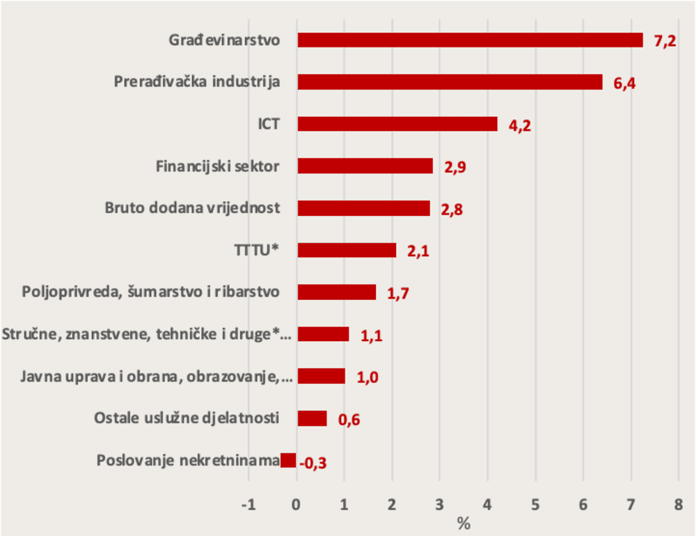 Grafikon 4 pokazuje da je građevinarstvo u prošlom kvartalu i dalje bilo vodeće prema stopi rasta realne bruto dodane vrijednosti. Građevini su se priključile dvije djelatnosti koje su u ranijim kvartalima bile nisko – prerađivačka industrija i ICT. Tu promjenu možemo povezivati s ranije prikazanom obnovom trenda rasta produktivnosti i s oporavkom izvoza: rast produktivnosti rada usporava kada izvoz stagnira, jer ako djeluje samo domaća potražnja, ona snažnije povlači samo radno-intenzivne djelatnosti.