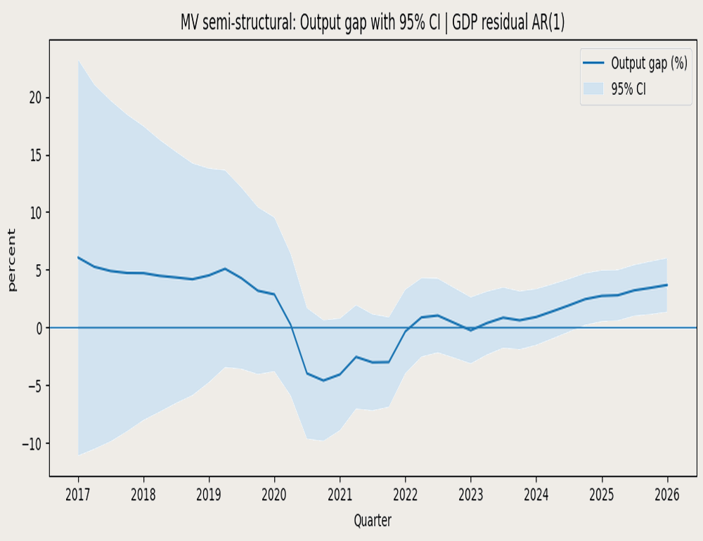 Na temelju kvartalnih podataka o kretanju realnog BDP-a 2016:Q4-2025:Q4 procijenit ćemo jaz outputa – odnos stvarnog i potencijalnog BDP-a. Ako je stvarni BDP iznad potencijalnog, očekujemo da će rast usporiti, i obratno. Podaci su prvo sezonski prilagođeni, a zatim je napravljen jednostavan model procjene jaza outputa koji kontrolira za covid-šok 2020., supply-side komponentu inflacijskog šoka i “drift” prirodne stope nezaposlenosti. Uvid u model možete dobiti od autora na vsonje@arhivanalitika.hr. Slika pokazuje: (1) vrlo nepouzdanu procjenu jaza outputa prije covida (pa se ne može izvesti dovoljno pouzdan zaključak da je jaz outputa tada bio pozitivan iako linija to pokazuje – zato je prikazana širina intervala ocjene), (2) zatim pokazuje snažnu indikaciju negativnog jaza outputa 2020.-2021. koja je najavila snagu oporavka 2021., nakon čega je slijedila normalizacija (makroekonomska ravnoteža) 2022.-2023., a potom, zahvaljujući snažnoj ekspanziji domaće potražnje i (3) ulazak u razdoblje pozitivnog jaza (stvarni output iznad potencijalnog) 2024.-2025. Pri tome treba uočiti da je i donji rub intervala pouzdanosti jaza outputa sada iznad makroekonomske ravnoteže, što ukazuje na vjerojatno daljnje usporavanje rasta.