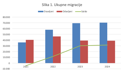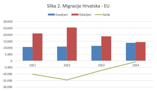 Državni zavod za statistiku objavio je podatke o migracijama za prošlu godinu. Podaci potvrđuju da je Hrvatska nakon velikoga vala neto emigracije 2014.-2018. ušla u veliki val neto imigracije koji je započeo 2022. i poprimio ozbiljne razmjere 2023. i 2024. (Slika 1). Migracijski saldo, tj. razlika doseljeni minus odseljeni, povećan je s 30,2 tisuće 2023. na 31,4 tisuće 2024. Kako učinak negativnog prirodnog prirasta u Hrvatskoj (višak umrlih nad rođenima) iznosi oko 19 tisuća na godinu, migracijski saldo više nego kompenzira prirodni trend tako da je broj stanovnika Republike Hrvatske prošle godine osjetno rastedrugu godinu zaredom. To su prvi slučajevi godina s osjetnim rastom broja stanovnika u ovome stoljeću.