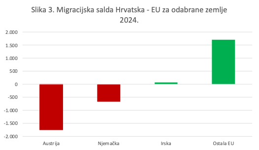 Ako se promatra po zemljama, prošlogodišnji migracijski saldo i dalje je negativan u odnosu na Njemačku i Austriju. U odnosu na druge države članice EU saldo je u plusu (najviše u odnosu na Sloveniju i Italiju). Najzanimljivije je da se Irska više ne pojavljuju u skupini atraktivnih država za iseljavanje: 2024. je bilo više iseljavanja iz Irske u Hrvatsku, nego iz Hrvatske u Irsku.