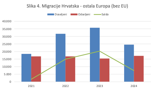 Metodologija je važna jer Europa koja nije EU – osobito Bosna i Hercegovina, Srbija, Makedonija i Ukrajina – značajno je ishodište doseljavanja u Hrvatsku (Ukrajina tek nakon početka rata 2022.). Migracijski saldo s tim zemljama (Slika 4) i dalje je pozitivian, ali je manji nego 2022. i 2023. To je rezultat naglog pada doseljavanja 2024. u odnosu na 2022. i 2023. godinu što objašnjavamo stabilizacijom života u ratom pogođenoj Ukrajini: tko je želio i mogao iseliti, iselio je u prve dvije ratne godine i sada se hrvatski migracijski saldo s ostalom Europom koja nije u EU normalizira između 5 i 10 tisuća na godinu.