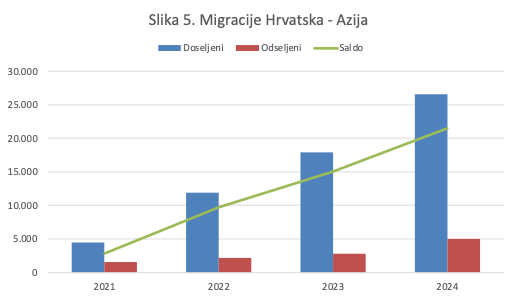 Azija je već nekoliko godina važniji izvor doseljavanja radnika u Hrvatsku od ostale Europe bez EU. Doduše, u 2024. po prvi puta vidimo osjetan rast iseljavanja u Aziju (5,000), što je vjerojatno posljedica povratka kući dijela radnika-imigranata koji su prethodno dulje boravili u Hrvatskoj. Unatoč tome, rast doseljavanja u Hrvatsku iz Azije dominantan je trend te se pozitivan hrvatski migracijski saldo s Azijom (više doseljenih nego odseljenih) povećao s 15 tisuća 2023. na 21,5 tisuću 2024. te predstavlja najvažniju odrednicu pozitivnog migracijskog salda. Saldo s azijskim državama određuje približno dvije trećine pozitivnog migracijskog salda Republike Hrvatske.