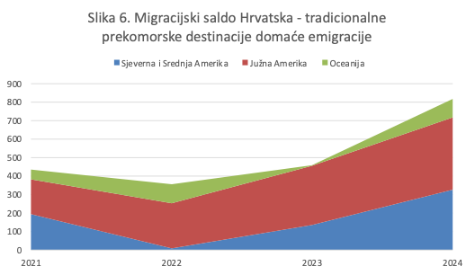 Tijek povijesti se preokrenuo: kao što vidimo na Slici 6, Hrvatska bilježi pozitivan migracijski saldo s obje Amerike i Oceanijom. Ukupno je riječ o 818 više doseljenih nego odseljenih ljudi u 2024. godini.