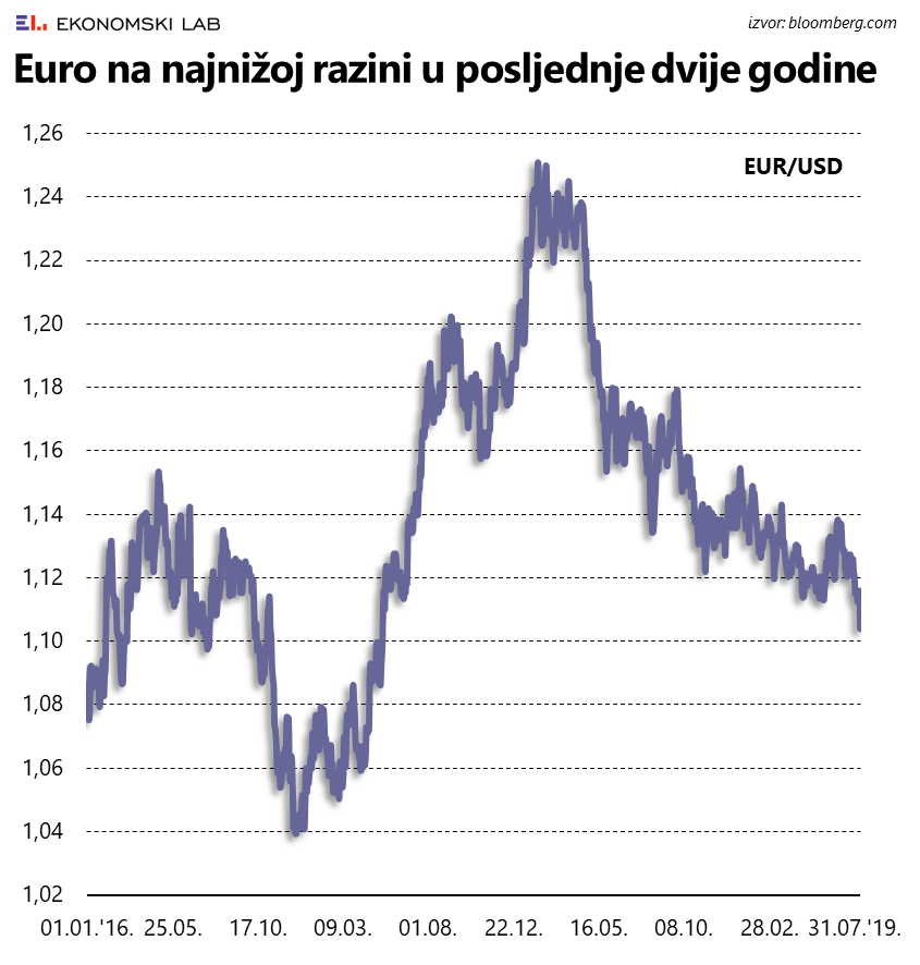 U nekim drugim okolnostima, smanjenje kamatnih stopa trebalo bi smanjiti atraktivnost pojedine valute. Međutim, u ovom je slučaju u igri bila i opcija agresivnijeg snižavanja kamatnih stopa (za 50 baznih bodova), koja bi značajnije smanjila kamatni spread na relaciji dolar – euro (i znatnije oslabila pozicije dolara), pa je smanjenje upola slabijeg intenziteta očito protumačeno pozitivno za dolar. Posebice u uvjetima kada se Europska središnja banka užurbano priprema za primjenu još ekspanzivnije monetarne politike što prijeti erozijom tečaja eura. O tome je već bilo govora na Ekonomskom labu, a predstojeća smjena u tornju u Frankfurtu te dolazak Christine Lagarde, koja ne pridaje previše značaja ortodoksnim idejama iz rigidne Bundesbank kuhinje, vjerojatno će rezultirati dodatnim pritiskom na euro.