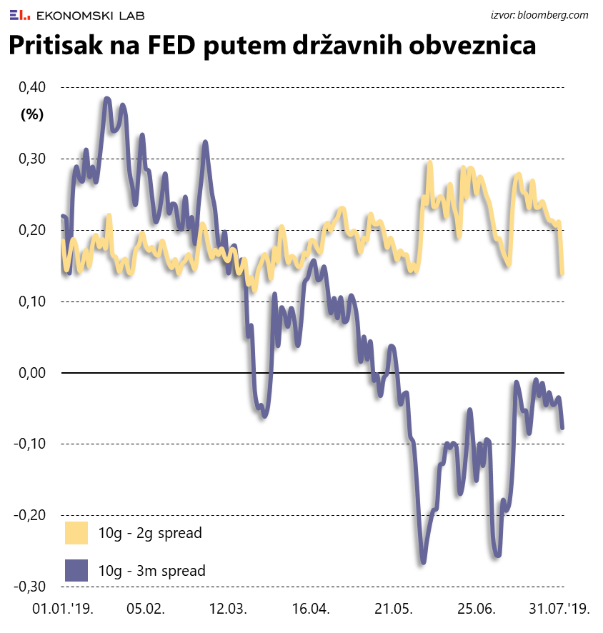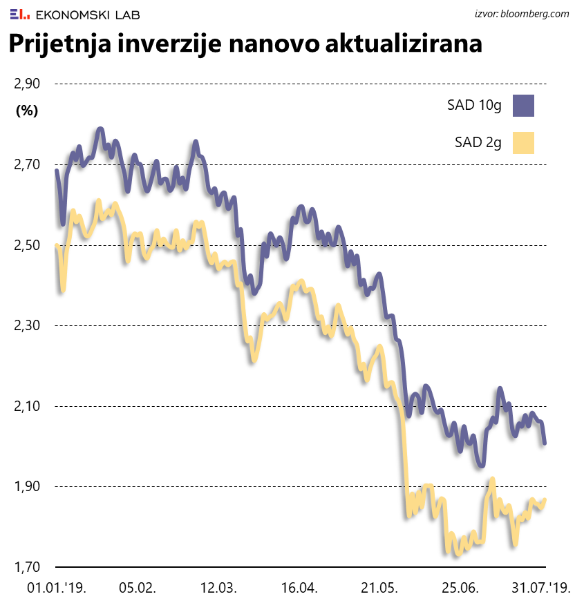 Da stvari budu dodatno komplicirane pobrinuo se opet – Donald Trump. Dan nakon FED-ove odluke tj. u četvrtak, u sred pregovora s Kinezima (za koje su mnogi očekivali da će dobro završiti), Trump je uveo novu rundu carina po stopi od 10% na oko 300 milijardi dolara vrijednog uvoza iz Kine. Izgleda da sada na tržištu prevladava stav kako je daljnje zaoštravanje trgovačkog rata kontraproduktivno, pa je jedna od prvih posljedica predsjednikove odluke bio pad dugoročnih američkih prinosa (10-godišnji ispod 2%, na 1,9%). Tu promjenu treba tumačiti kao vrlo brzo obaranje očekivanje inflacije i prijetnju recesije.