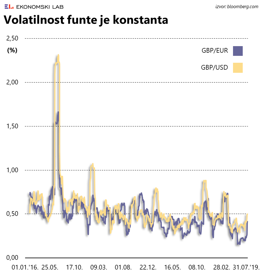 I dok je paritet scenarij koji se trenutno čini malo vjerojatnim (ali zato vrlo neugodnim u očima većine Britanaca), velike oscilacije funte svakodnevna su pojava na deviznom tržištu. Naravno, fluktuacija tečaja u ovoj godini teško se može usporediti s kaosom koji je uslijedio neposredno nakon objave rezultata referenduma 2016. godine, no svejedno višestruko nadmašuju promjene većine valutnih parova. Mjereno dvadesetodnevnom rolling standardom devijacijom (dnevnih promjena), volatilnost tečaja GBP/USD i GBP/EUR redovito prelazi 0,5% (zamjetno iznad volatilnosti EUR/USD tečaja, koji se definitivno ne može pohvaliti stabilnom putanjom), i najbolje svjedoči o tjeskobi investitora kada je funta u pitanju. Ona teorija da se na taj način jača konkurentnost britanskog izvoza teško drži vodu jer funta je u proteklih 11 godina izgubila najviše na vrijednosti od svih vodećih svjetskih valuta, no rezultat nije bio britanski izvozni boom nego veća inflacija i slabiji rast realnih plaća nego u drugim razvijenim zemljama, što je samo po sebi moglo utjecati na ishod referenduma. Nema razloga za uvjerenje da će u budućnosti biti drugačije, osobito nakon što je britanska automobilska industrija u slučaju hrad Brexita najavila – armagedon.