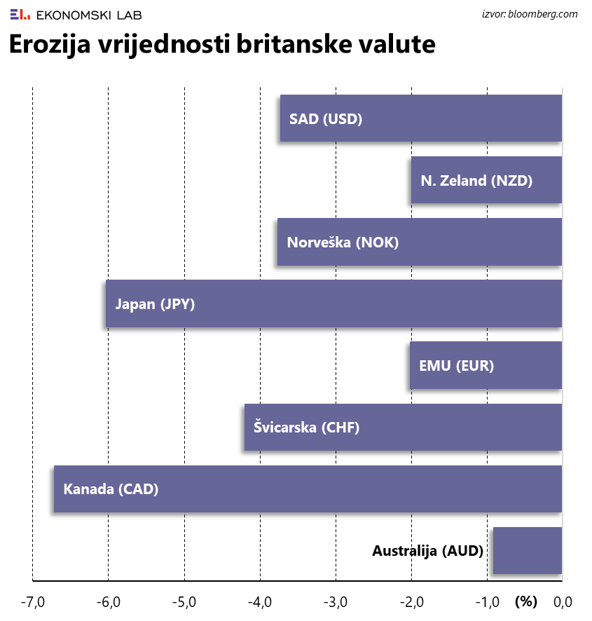 Vjerojatno nikoga nije iznenadilo, ali najnovije posrtanje funte svejedno je uzburkalo duhove na deviznom tržištu. Britanska se valuta spustila na najnižu razinu u odnosu na euro, i svega nekoliko centi je dijeli od povijesnog minimuma (1,079 eura), evidentiranog u kolovozu 2017. godine.