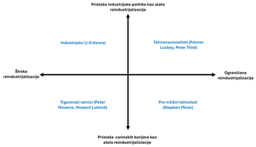 Uzmimo kao primjer pitanje reindustrijalizacije. Jedan dio američke administracije zagovara “industrijsku renesansu“, tj. povratak širokog spektra industrijske proizvodnje u SAD, dok drugi dio smatra kako je potrebno provesti usko koncipiranu reindustrijalizaciju koja bi pokrivala isključivo strateške sektore. Takvoj opreci u gledištima oko konačnog cilja odgovara i podjela oko poželjnih instrumenata za njegovo ostvarenje. Dok jedan dio administracije zagovara sveobuhvatne carine, drugi dio smatra kako su potrebne isključivo selektivne carine. Druga važna razdjelnica vidljiva je u tome što dio Trumpove administracije gaji duboku skepsu spram administrativnog kapaciteta američke države i općenito ideje provođenja industrijske politike, dok drugi dio smatra da je američka industrijska politika pravi odgovor na kineski pokušaj tehnološke dominacije u 21. stoljeću, što bi se trebalo nadovezati na Bidenovu strategiju reindustrijalizacije pokretnute putem Inflation Reduction Act-a i CHIPS and Science Act–a (vidi Sliku 5).
