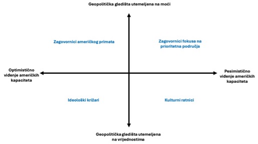 Zadnje, i ne najmanje važno, Trumpova administracija također je podijeljena oko razine američkog angažmana u svijetu i ciljeva koji opravdavaju taj angažman. Oni koji vide mogućnost snažnog internacionalnog angažmana SAD-a, kao u razdoblju američke unipolarnosti, dijele se na one koji zagovaraju fokus na prioritetna područja i regije, dok su s druge strane kulturni ratnici kojima je prioritet ne samo obračun s ekscesima “woke kulture“ i identitetskih politika, već i širi napad na sustav liberalne demokracije. Nasuprot njima stoje optimisti u pogledu američkih kapaciteta za nastavak politike Pax Americane, pri čemu se razlikuju oko toga da li na prvo mjesto dolazi američko održanje primata u svijetu, neovisno o ideološkoj matrici, ili izvoz američkih vrijednosti po uzoru na neokonzervativce (vidi Sliku 6). Na samu heterogenost administracije nadovezuje se osobnost Donalda Trumpa koji uživa u poziciji de facto monarha, arbitrirajući između različitih centara moći koji se bore za njegovu pažnju, čime implicitno i cinično potiče unutarnje podjele u MAGA pokretu kako bi ojačao svoju osobnu poziciju.