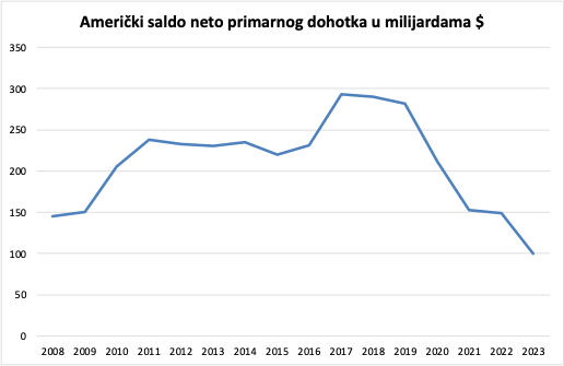 Od 1950-ih naovamo, “izvanredna privilegija“ iznosila je godišnje 1,5% postotna boda u realnim terminima i omogućavala je održivost američkog vanjskog duga. Međutim, Slika 7 pokazuje značajan pad neto primarnog dohotka, sa 292 milijardi dolara godišnje u 2017. na 100 milijardi dolara u 2023. godini.