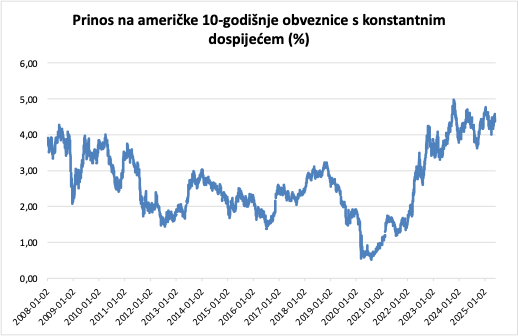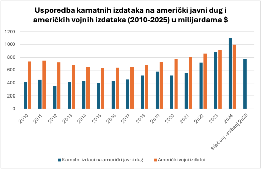 Drugi negativan trend – rast “prinosa na praktičnost“ – prikazuje Slika 8. Nakon globalne financijske krize 2008. “prinos na praktičnost“ kontinuirano je padao pod utjecajem nekoliko rundi kvantitativnog popuštanja. Ipak, nakon pandemije, rekordni deficiti Bidenove i Trumpove administracije, te Trumpova otvorena demontaža globalnog trgovinskog sustava, utječu na izrazito povećanje prinosa na 10-godišnje američke državne obveznice s konstantnim dospijećem. Ovakav trend u kratkom je periodu gotovo udvostručio troškove otplate kamata po osnovu američkog javnog duga, pa su 2024. kamate po prvi puta u američkoj povijesti kamatna plaćanja bila viša od američke vojne potrošnje (vidi Sliku 9).