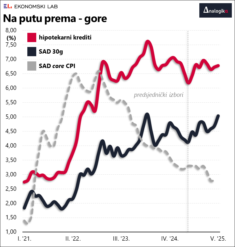 Nepovoljan trend datira još od početka 2021. godine uslijed pandemijom isprovociranog kraha globalnih lanaca opskrbe i dramatičnog rasta inflacije. Makar je inflacija u međuvremenu zauzdana, to ipak nije ostavilo značajnijega traga na dugoročne kamatne stope, a posredno onda niti na trošak zaduživanja za kupnju nekretnina (crvena krivulja na slici predstavlja fiksnu kamatnu stopu na hipotekarne zajmove na rok od 30 godina):