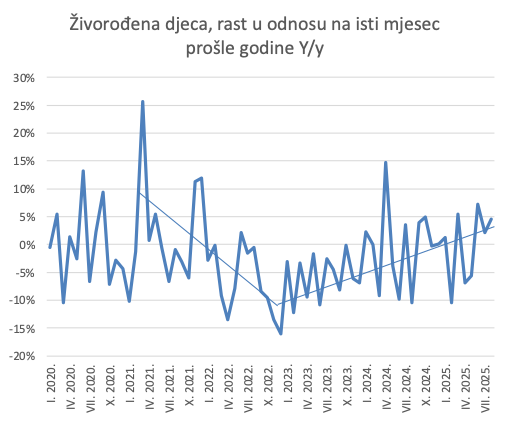 Na slici vidimo dramatičan pad broja živorođene djece u Hrvatskoj koji je kulminirao potkraj 2022. i početkom 2023. Tada se godišnja promjena broja živorođene djece kretala između -10 i -15%. Ipak, od jeseni 2023. pad je bivao sve blaži. Podaci za zadnja tri mjeseca (lipanj: 7,3%; srpanj 2,2% i kolovoz 4,5%) potvrđuju da je tempo rađanja djece ušao u pozitivno područje (a jučer objavljen podatak o +10,7% u rujnu to potvrđuje).