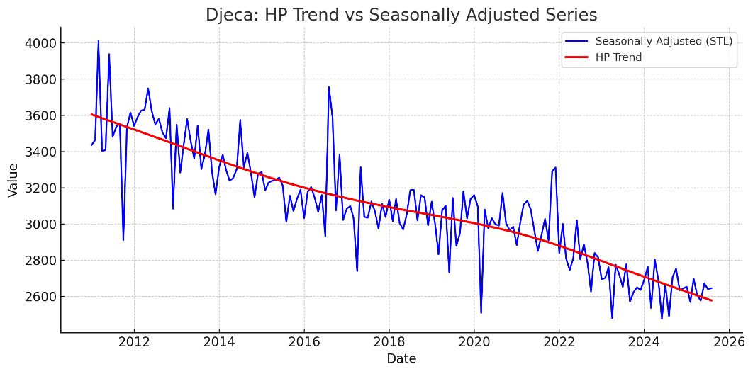 Na sljedećoj slici vidimo mjesečni broj živorođene djece koji je korigiran za uobičajene sezonske faktore. Iz sezonski prilagođenih podataka izlučen je dugoročni trend. Dugoročni trend je ono s čime se bave demografi: oni ga nastoje objasniti, predvidjeti buduća kretanja i predlagati politike koje bi taj trend mogle promijeniti.