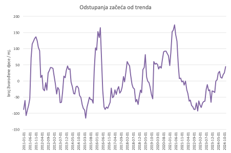 Najvažnije je uočiti da važnost kratkoročnih oscilacija začeća oko dugoročnog trenda ni približno nije tolika kao važnost trenda. Trend-vrijednost mjesečno živorođene djece pred 15 godina bila je oko 3 600, a sada smo na oko 2 650 u prosjeku (prosjek za zadnjih 12 mjeseci). Odstupanja od trenda kreću se u rasponu +/- 150 djece na mjesec, što je svega do 15% od 15-godišnje trendne razlike koja iznosi oko 1 000 djece na mjesec (2025. naspram 2011.).