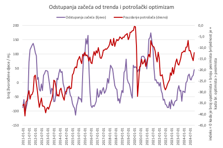 - Od sredine 2021. uspostavljena je čvrsta pozitivna korelacija (koeficijent 0,58) između potrošačkog pouzdanja i odstupanja začeća od trenda. Prema tome, pad pouzdanja potrošača u razdoblju ubrzanja inflacije 2021.-2022. bio je usko koreliran s padom viška začeća. Inflacija koja je u početku rasla brže od plaća imala je negativne demografske posljedice.