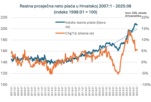 Prema tome, negativna odstupanja začeća od trenda koja su trajala 2021. i do polovice 2022. (a koji je na seriji rađanja djece trajao devet mjeseci duže), podudaraju se s negativnim sentimentom potrošača zbog visoke inflacije koja je od početka 2022. bila pojačana skokom cijena energenata i drugih cijena zbog rata u Ukrajini. Moguće je da je i sam medijski ambijent nakon početka prvog velikog rata na tlu Europe nakon post-jugoslavenskih ratova utjecao na negativna odstupanja od trenda. Međutim, primarni uzrok ipak leži u tadašnjem padu realnih plaća zbog visoke inflacije. Odstupanja začeća nalazila su se u negativnom području gotovo dvije godine, što je najdulji period negativnih odstupanja od trenda u zadnjih petnaest godina. Odstupanja su prešla u pozitivnu zonu neposredno nakon što se rast realnih plaća vratio u pozitivnu zonu početkom 2023. (sljedeća slika):