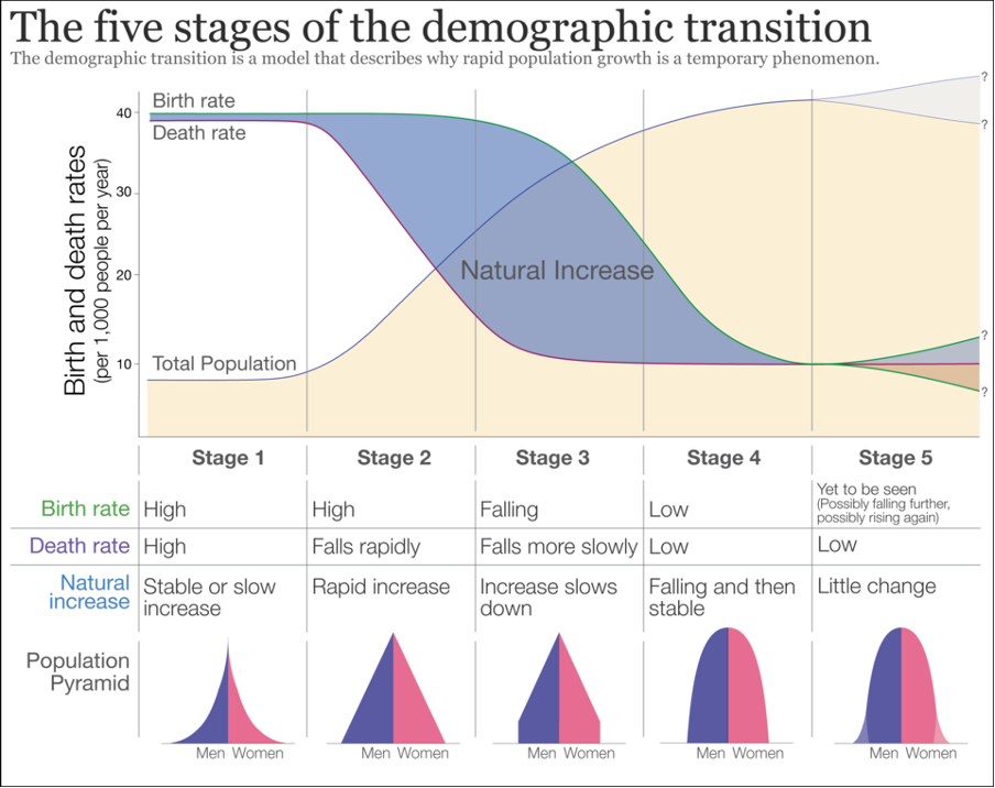 Prema modelu koji je prikazan na donjoj slici, Hrvatska se nalazi na početku pete faze demografske tranzicije. Ishod te faze je neizvjestan (uočite male upitnike desno na slici). Japan je u petoj fazi najdalje odmaknuo, no razvijeni dio svijeta kojem pripadamo generalno se nalazi tek na početku te faze. U Hrvatskoj su stope nataliteta i mortaliteta već veoma niske, broj stanovnika ne raste – počeo je dugoročno padati čak i ako ne uzimamo u obzir efekte ratnih zbivanja 1991.-1995. – a prosječni godišnji prirodni priraštaj je negativan (-16 366 za razdoblje 2011.-2024.). Zasad izgleda da je promjena dugoročnog trenda u petoj fazi čvrsto nagnuta prema dolje (linija na slici koja vodi prema donjem upitniku):