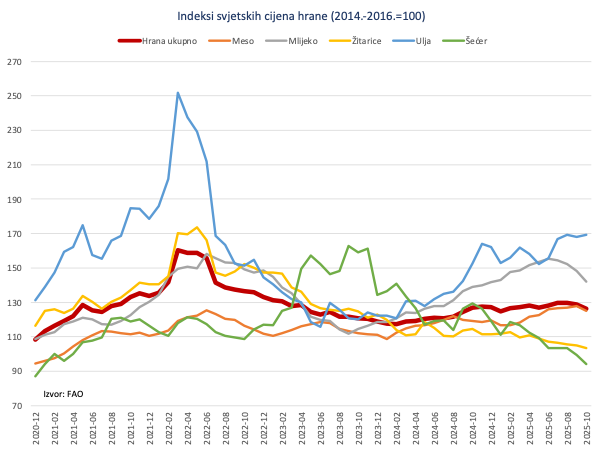 Relativno snažan doprinos cijena hrane, pića i duhana inflaciji u 2025. možemo podijeliti na dva dijela. Jedan dio je nastao zbog prelijevanja rasta cijena hrane sa svjetskoga tržišta. Pritisak se posebno snažno osjetio širom srednje i istočne Europe gdje hrana i pića čine veći dio potrošačkih košarica nego u košaricama bolje stojećih potrošača na zapadu EU (u Hrvatskoj je hrana oko 20%, a s pićima i duhanom gotovo 30% košarice). Slika u nastavku pokazuje kretanje FAO-ovih indeksa svjetskih cijena hrane: sredinom 2025. godine indeks je bio oko 6% veći nego sredinom 2024. No, već u rujnu ove godine rast cijena smanjio se na oko 3% u odnosu na rujan 2024., a u listopadu 2025. cijene prehrambenih sirovina vratile su se na razinu iz listopada prošle godine: