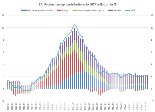 Kada je riječ o domaćoj potražnji kao pokretaču inflacije pažnju treba posvetiti cijenama usluga. Cijene sluga jače reagiraju na rast potražnje od cijena hrane (dohodovno su elastičnije). Doprinos cijena usluga inflaciji u Hrvatskoj tvrdokorno se kreće između 2 i 2,5 postotna boda, što je više od pola ukupne stope inflacije (uočite visinu crvenih dijelova stupaca na prvoj slici). To je glavni razlog viška domaće inflacije iznad inflacije u europodručju. Naime, na sljedećoj slici vidimo da je doprinos cijena usluga inflaciji u europodručju ustrajno, to jest za gotovo cijeli postotni bod, niži nego u Hrvatskoj (doprinos usluga ukupnoj inflaciji u europodručju kreće se oko 1,5 postotna boda). To je logično, jer je pritisak rasta potražnje u europodručju slabiji nego u Hrvatskoj (iako usluge imaju puno veći udjel u potrošačkim košaricama u razvijenim zemljama zapada EU). Stoga se stopa inflacije u europodručju već dulje vrijeme kreće oko ciljanih 2%, a predstavnici ECB-a ustraju na izjavama da se monetarna politika i cijene nalaze upravo tamo gdje trebaju biti (usp. zadnji intervju Franka Eldersona: dakle, očekujte relativno stabilne kamatne stope u sljedećih godinu dana, unutar intervala +/- 0,25 postotnih bodova).