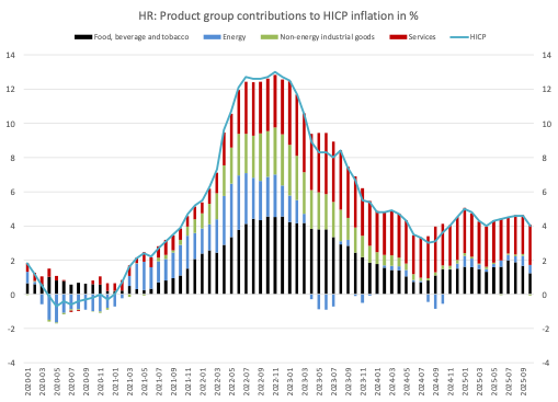 *Doprinos usluga nešto je slabiji u domaćem indeksu cijena jer ovo što gledamo je takozvani HICP – inflacija koja u pondere za računanje uključuje i potrošnju nerezidenata (turista) ako su iz EU.