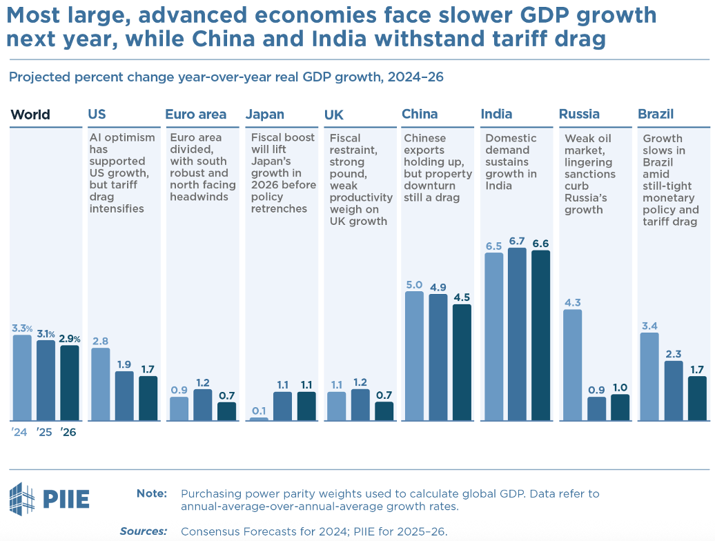 U PIIE očekuju da će gospodarstva europodručja i UK ostati anemična, no unatoč usporavanju zbog očekivanog pada izvoza u SAD, ovdje je prognoza također bez recesije. Kina će pak nastaviti usporavati kao i druga vodeća emerging markets, osim Indije koja čvrsto zauzima položaj najbrže rastućeg velikog gospodarstva na svijetu.
