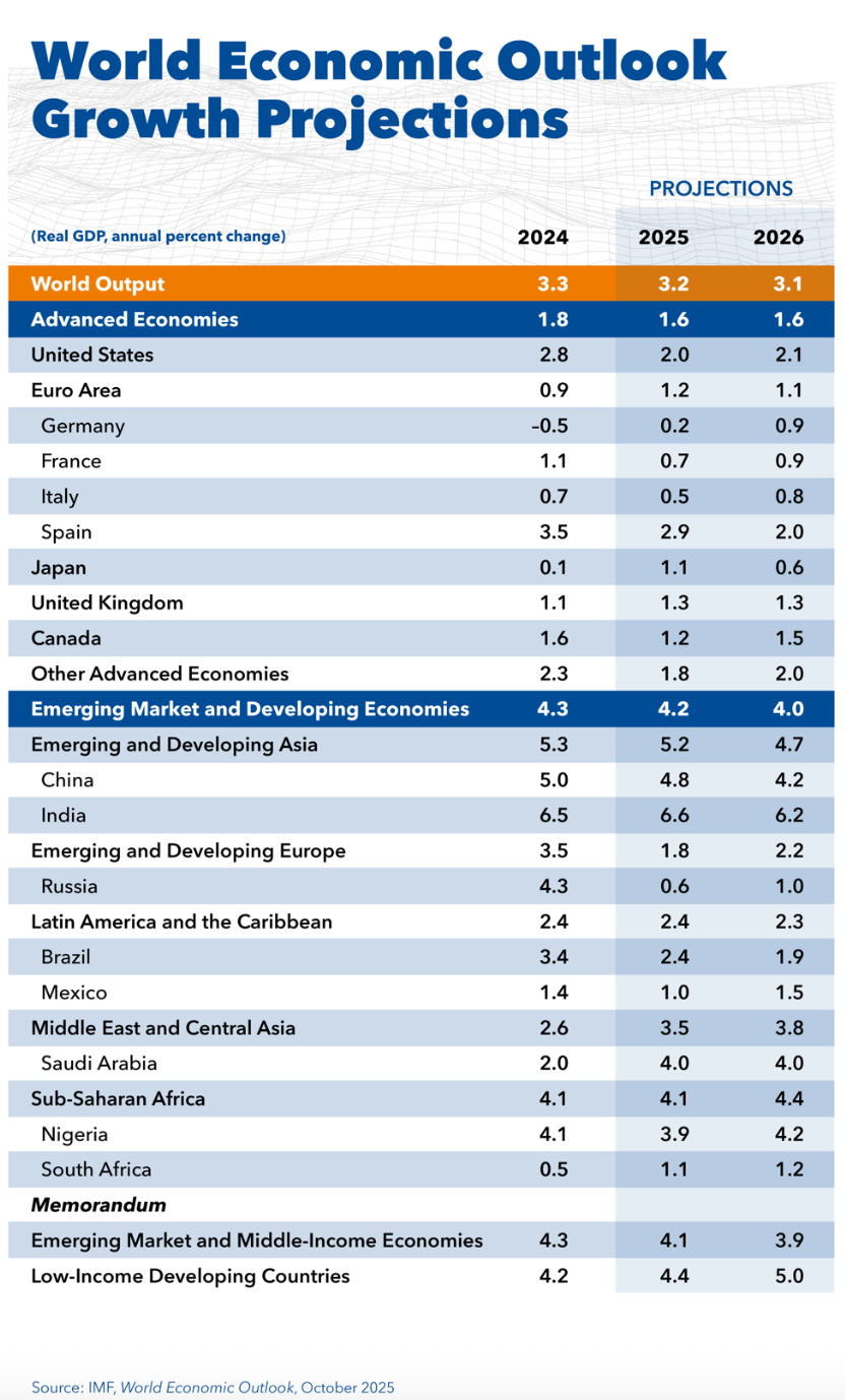 Glavni ekonomist MMF-a Pierre Gournichas opisuje budućnost na sličan način: otpornost globalnog gospodarstva na velike političke promjene objašnjava se: (i) razmjerno brzim sklapanjem novih trgovačkih sporazuma koji su smirili početnu eksploziju neizvjesnosti, (ii) brojnim izuzećima od carina u SAD-u i (iii) generalnom otpornošću i snalažljivošću privatnog sektora. Ipak, rizici su povećani zbog mogućnosti korekcije financijskih tržišta ako se optimistična očekivanja od ulaganja u AI ne materijaliziraju, te zbog prezaduženosti nekih država uslijed prevelikih fiskalnih poticaja – misli se prije svega na SAD – i privatnih sektora, prvenstveno kompanija u nekim državama. Poruke o prezaduženosti su direktno upućene SAD-u odnosno Donaldu Trumpu i njegovom ključnom čovjeku – ministru financija Scottu Bessentu (kao da oni mare za MMF).